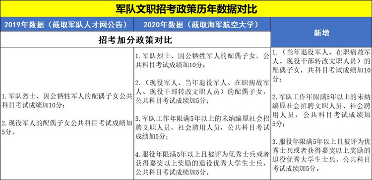 2020年軍隊(duì)文職考試預(yù)公告陸續(xù)發(fā)布!今年招考變化頗多,招錄人數(shù)增加、加分群體范圍擴(kuò)大、筆試內(nèi)容有調(diào)整、福利待遇增多、免試政策、戶口政策……